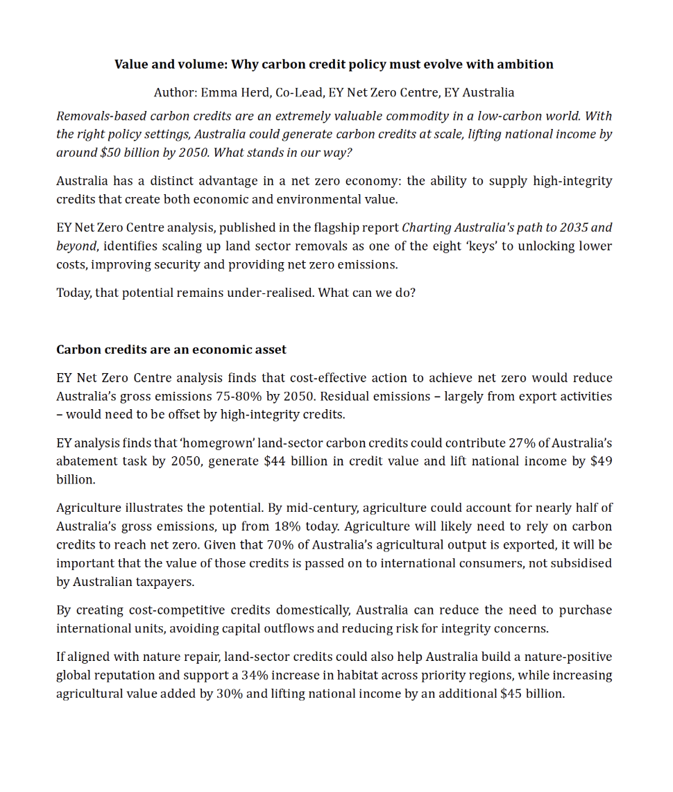 In this thought-provoking piece, Emma Herd, Co-Lead of EY’s Net Zero Centre, explores how Australia can unlock the full potential of carbon credits to deliver both climate and economic benefits. Drawing on EY’s latest analysis, she outlines the case for reforming carbon credit policy to drive large-scale removals, align with nature repair goals, and strengthen Australia’s position as a global supplier of high-integrity credits.